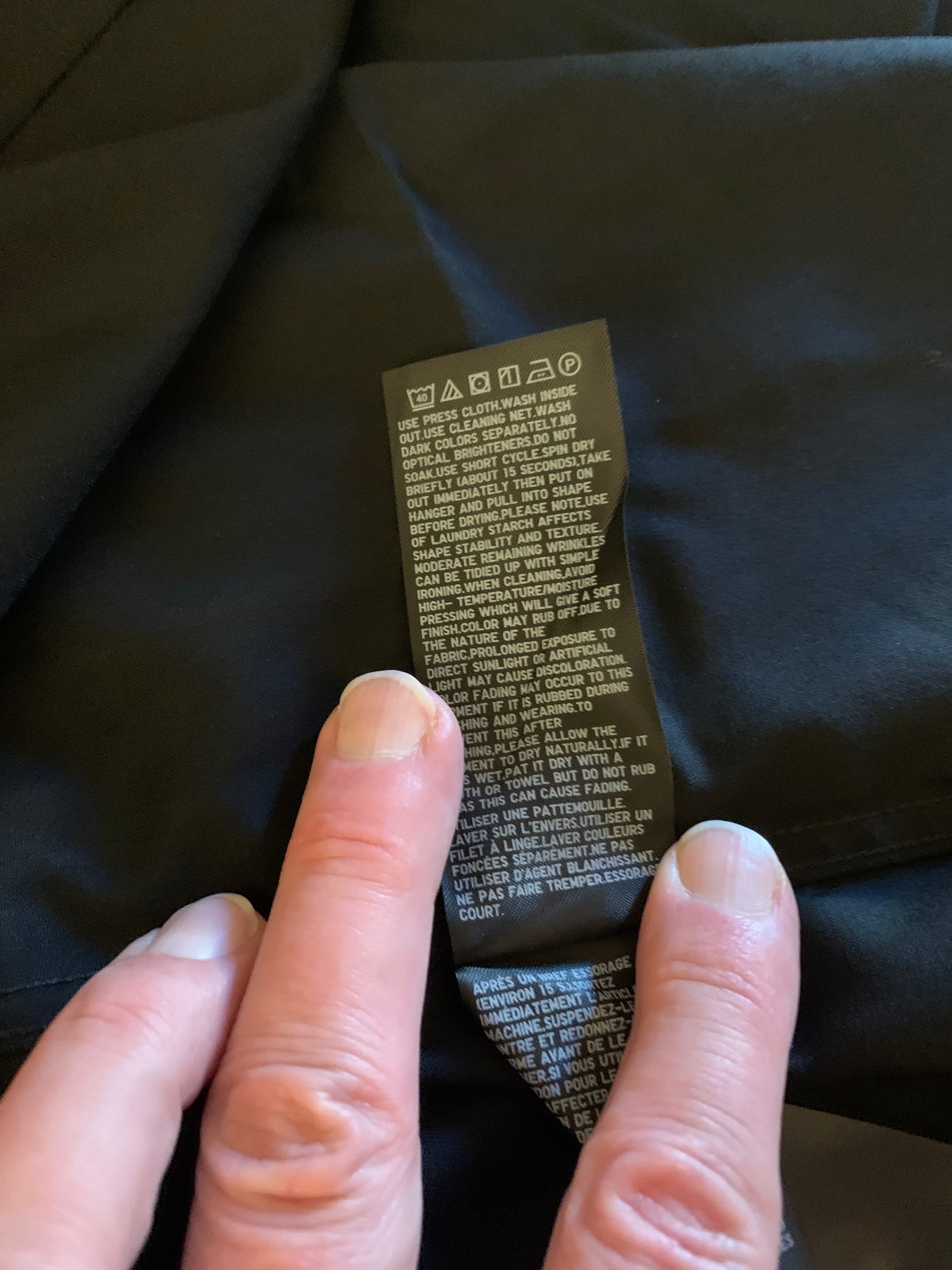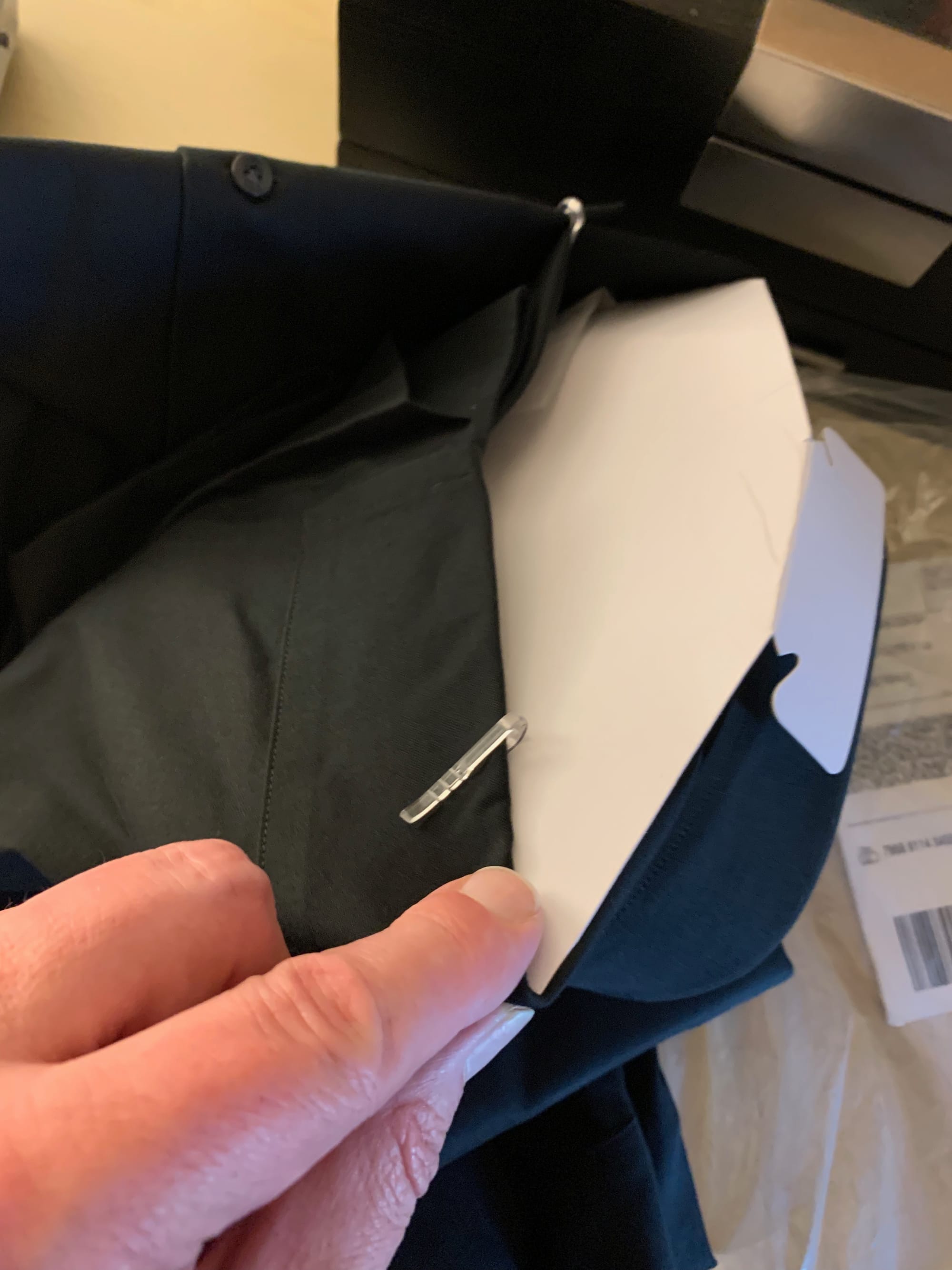 Three black shirts and two white ones. They're the "Super Non-Iron" ones. I like the way the fabric feels. There are no metal pins and the little plastic clips are cleverly deployed to be an absolute minimum number. They come with a few extra buttons and some collar stays, which are clear and easily lost. The collars don't need them – yet. I need to lose some weight.